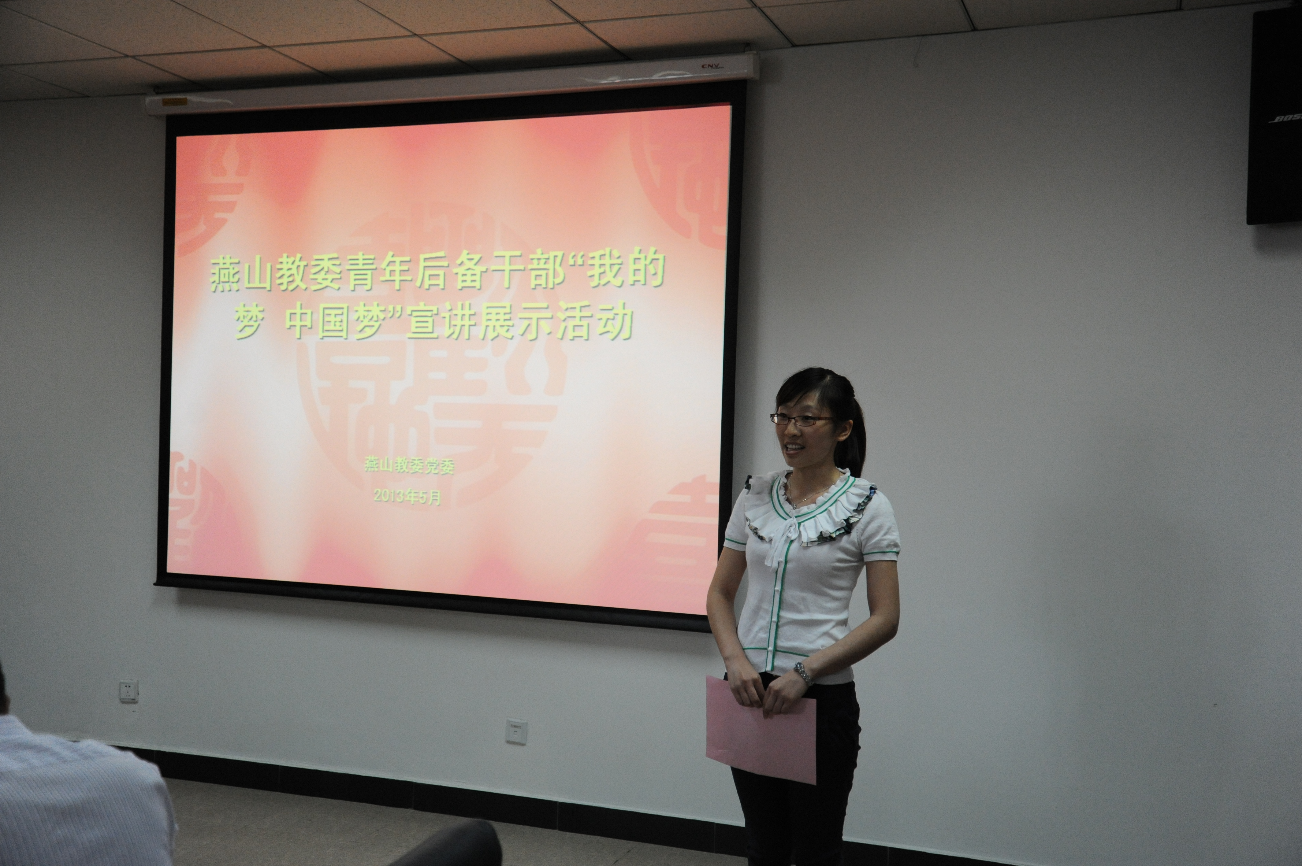 燕山教委“我的梦 中国梦”主题宣讲活动于2013年5月23日下午在燕山石化新材料产业基地二层会议室进行,此次活动结合燕山教委后备干部培训,43名后备干部作为观众聆听了此次宣讲。此次宣讲活动共有来自基层学校六名年轻教师参加宣讲,宣讲成员结合自己的教育梦想、教育历程及教育的心得体会进行宣讲。