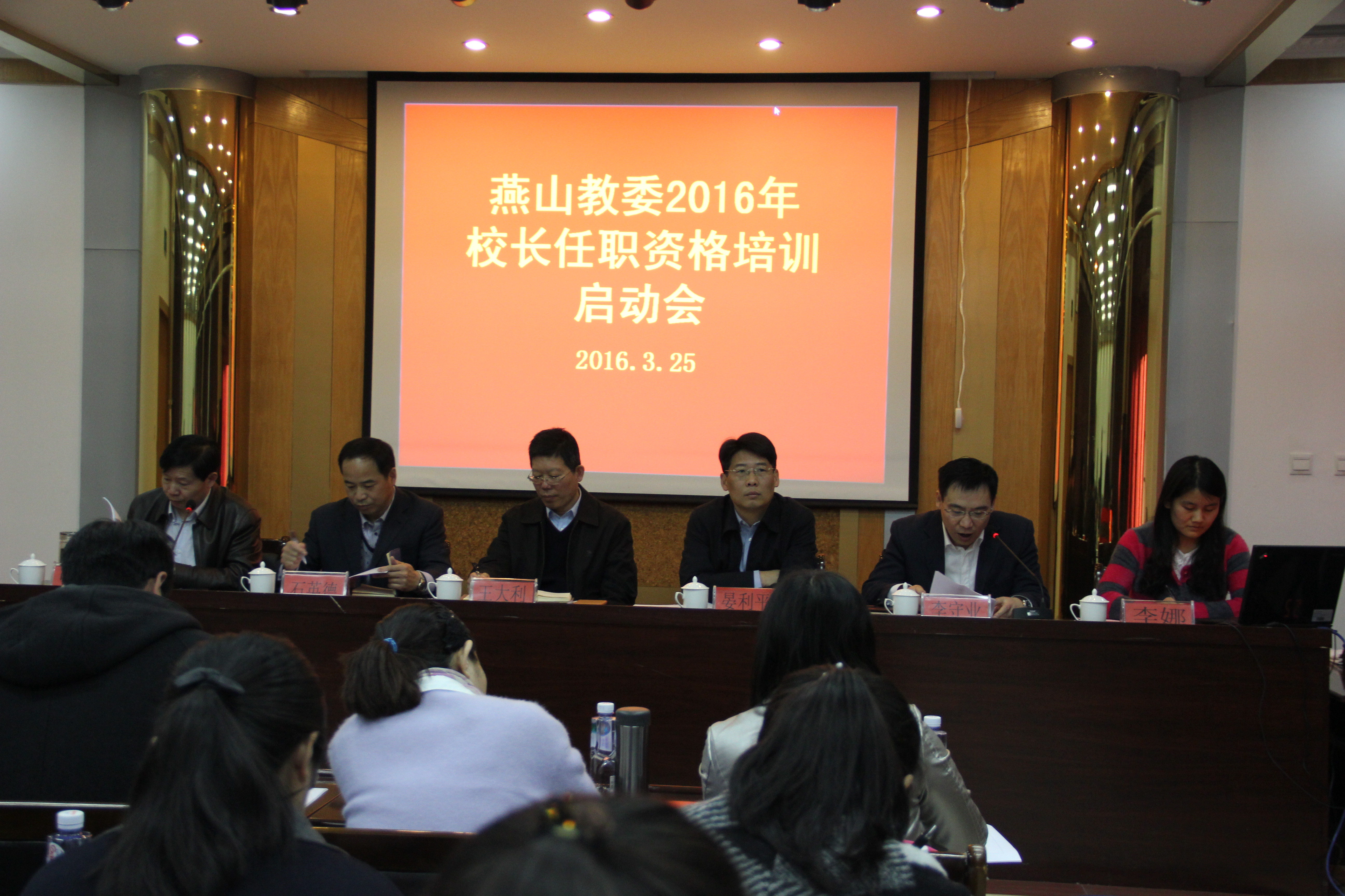 3月25日上午,燕山教委在职业学校北台基地会议室召开2016年校长任职资格培训启动会,会议由教委主任曾辉同志主持,燕山办事处副主任王大利,燕山工委委员、组织部部长晏利平,北京教育学院校长研修学院院长助理石英德教授,教委党委书记李守业,教委党委副书记张秋艳,项目负责人、北京教育学院李娜博士出席本次活动。