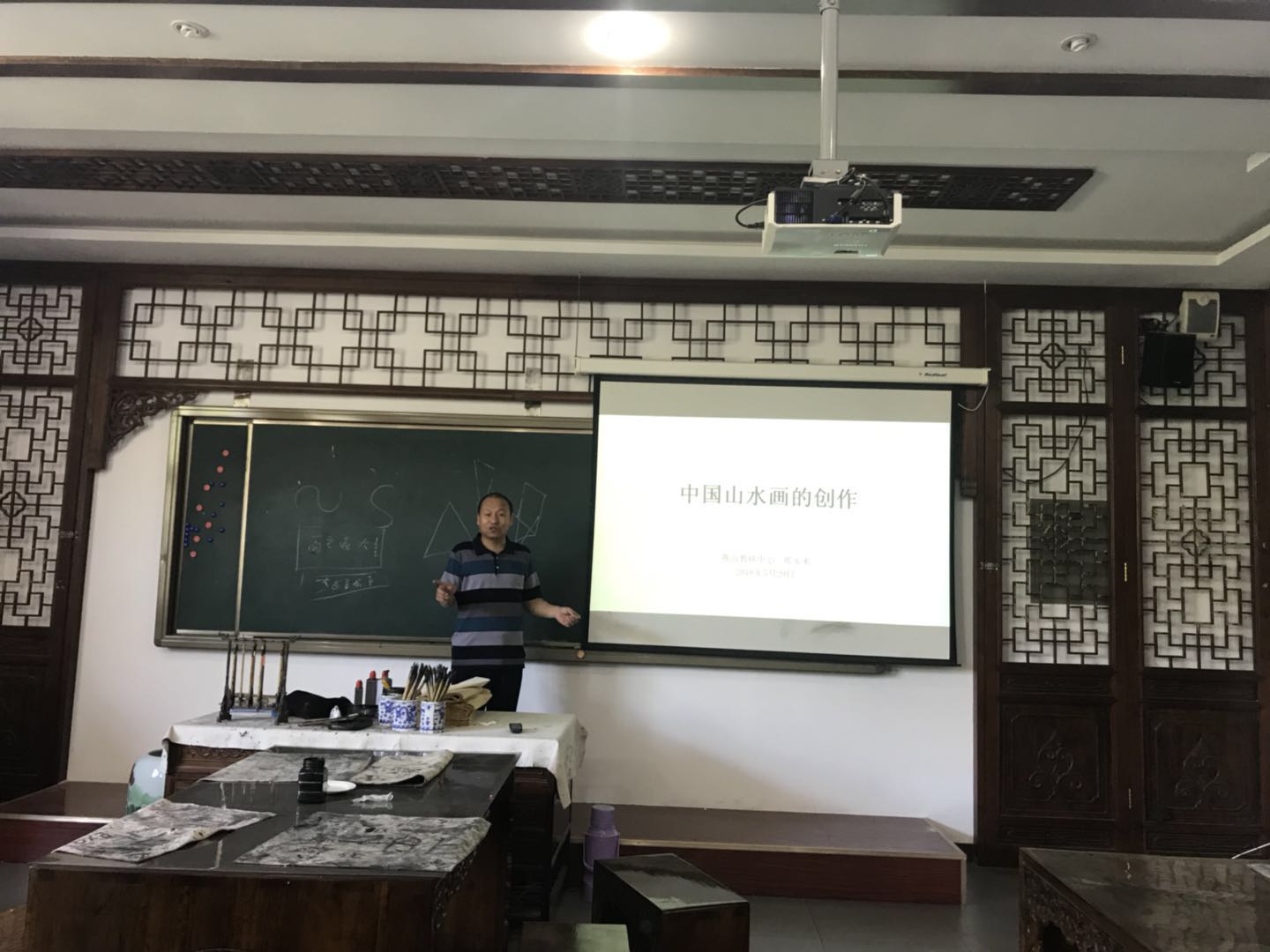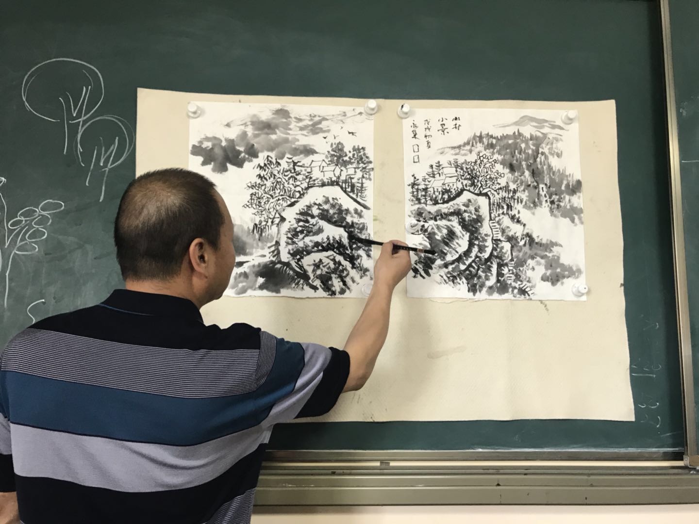 活动中,邢老师以山水画的发展为线索,结合对历代名家和近现代山水画大师作品及创作经验,较为详尽地介绍了山水画创作方法从“师造化”到“师古人”再到“搜尽其峰打草稿”的发展历程,并结合自身学习、创作的经历,鼓励老师们从小品画入手,把临摹和写生结合起来,积累更多的创作素材,逐步提升山水画的创作能力。随后,邢老师进行了小品画创作的示范,并提醒老师们在绘画实践中重视题款用印在章法布局的作用。邢老师的精彩讲解和现场示范得到了在场教师的一致好评。