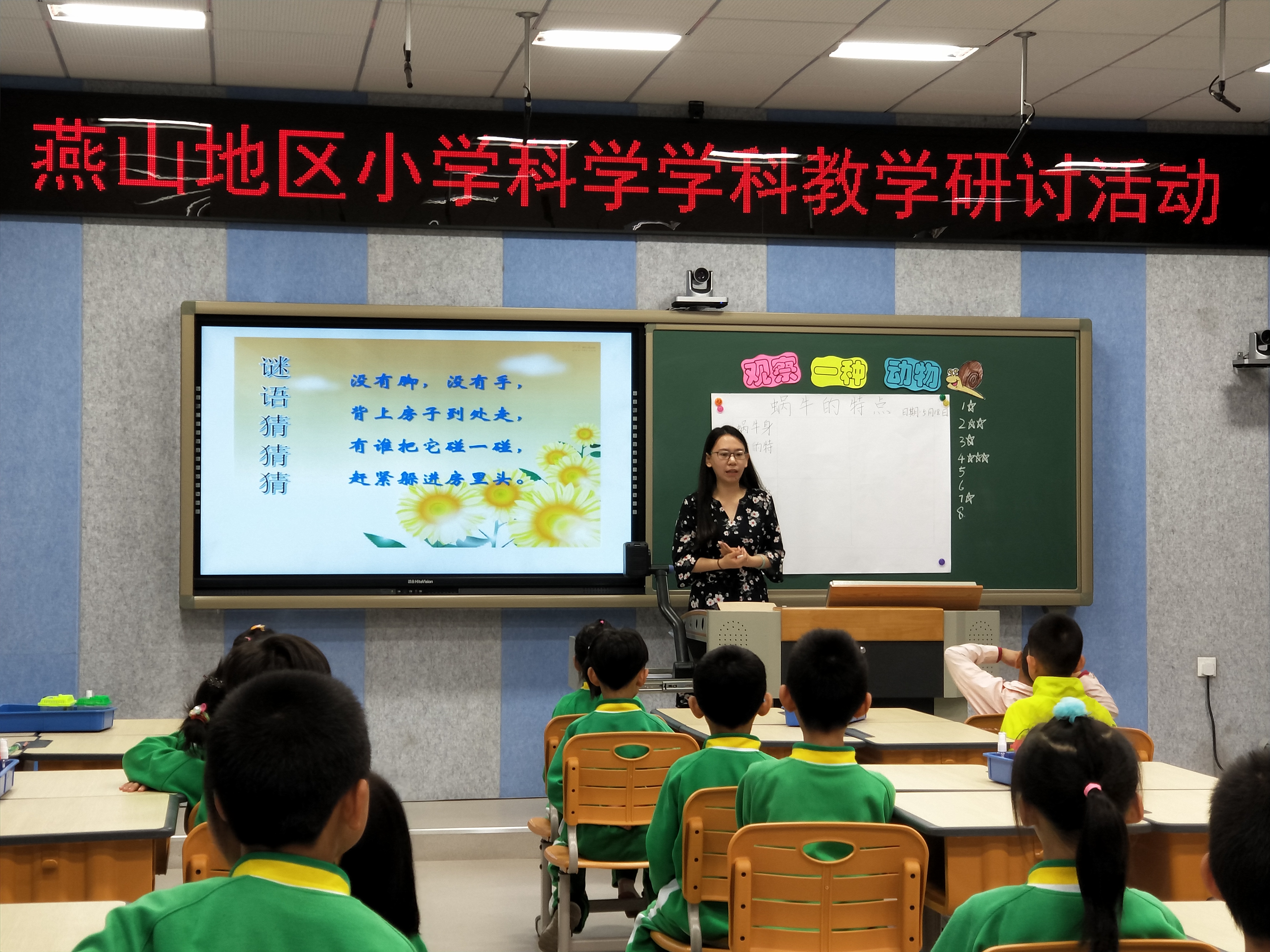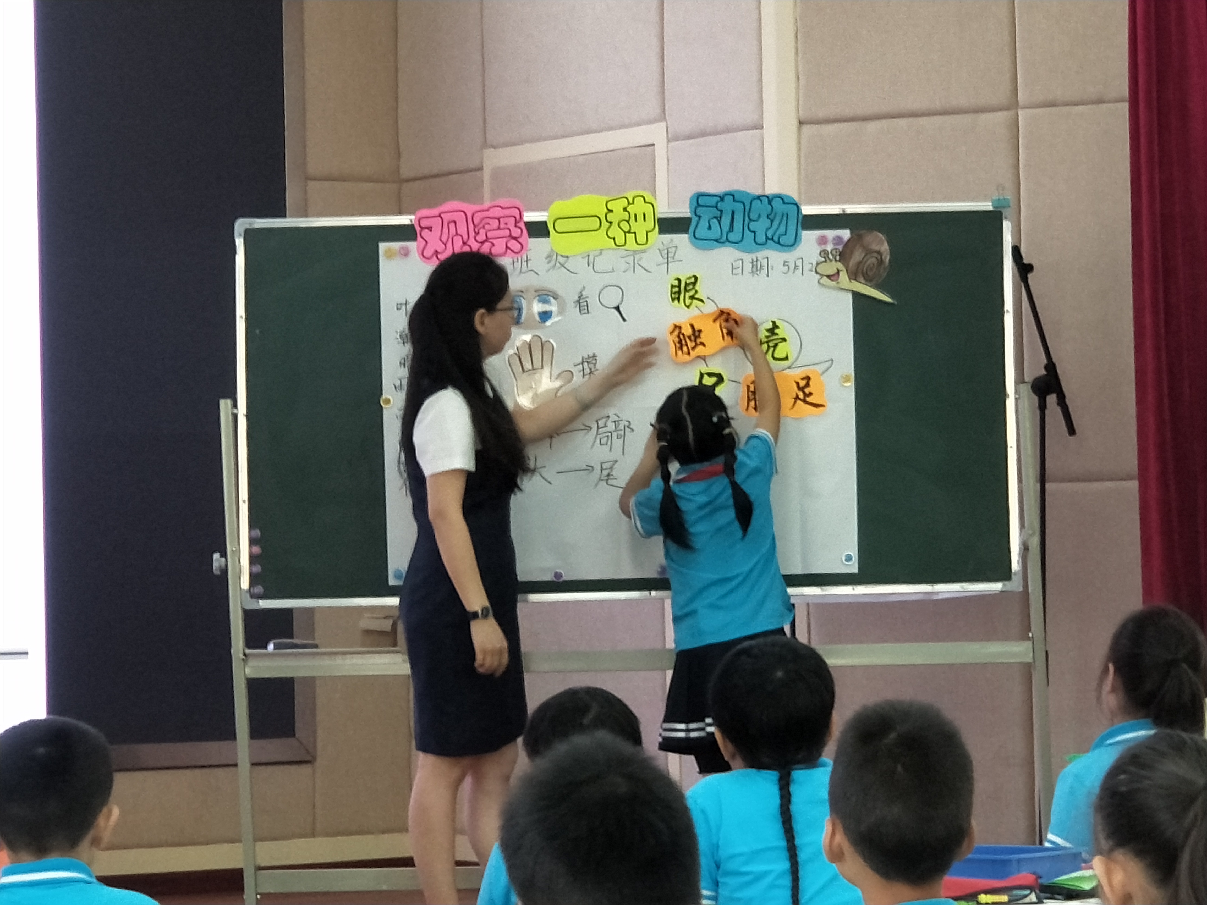 在区内与青年教师历经了“备课、磨课、研讨、交流、展示”的基础上,燕山科学教师团队参加了北京市小学科学教学研讨活动。四节展示课分别由房山、燕山、门头沟、石景山的四名科学教师授课,我区的李瑞婷老师执教一年级教科版教材第二单元第三课《观察一种动物(蜗牛)》。李老师在把握科学教材大单元的组织形式的基础上,围绕单元主题所指向的核心概念及科学核心素养的落实,精心组织教学进行教学设计。课上,孩子们对小动物蜗牛产生了极大地探究兴趣,并在李老师的指导下,经历了像科学家那样对蜗牛进行观察、思考、记录、描述和讨论等的探究过程;针对学生的需求,教学中教师适时出示有结构的科学学习的实验材料,如对小蜗牛的观察、放大镜的使用等,使教学井然有序,安排合理;另外,教学工具《科学学生活动手册》以及班级记录单等的利用,帮助了学生不断修正并完善对小蜗牛特点的认识,在获得科学概念的同时,更重要的是习得了科学观察的方法、科学思维的提升以及产生爱护小动物意识的形成,促进了四维教学目标的有效达成。